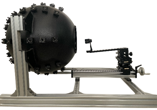 定制頻閃光纖積分球系統(tǒng),用于成像相機(jī)的成像視角定標(biāo),同時(shí)也可以用于評(píng)價(jià)成像的幀頻。系統(tǒng)包含內(nèi)壁全黑無反射積分球,頻閃LED光源盒及控制軟件。由積分球球壁等角度向球心發(fā)射準(zhǔn)直光束,每一束準(zhǔn)直光光斑直徑2mm,發(fā)散角較小,且亮度和閃爍頻率可調(diào)。